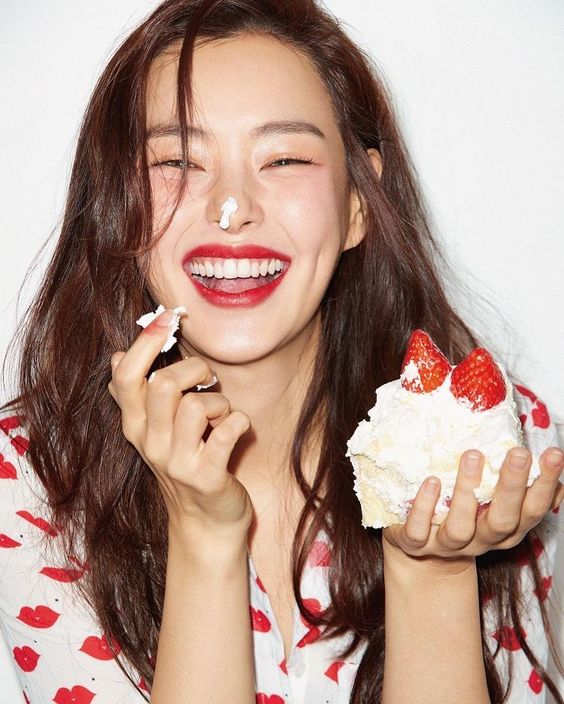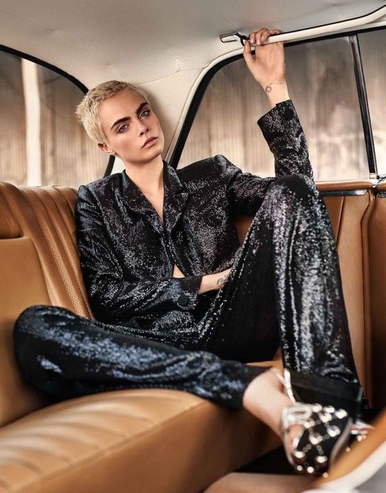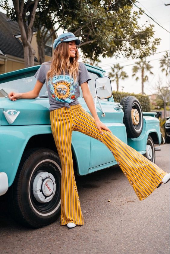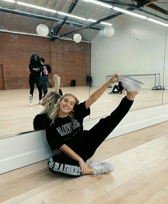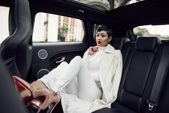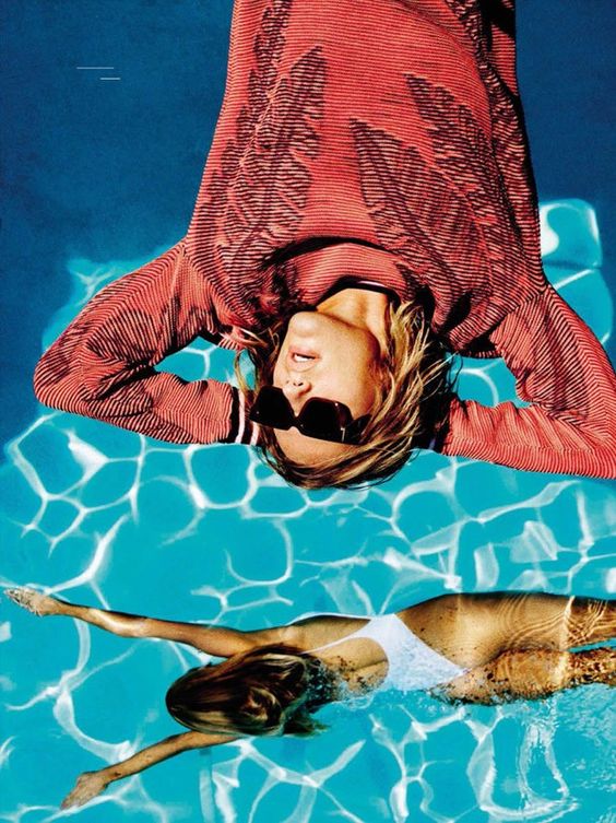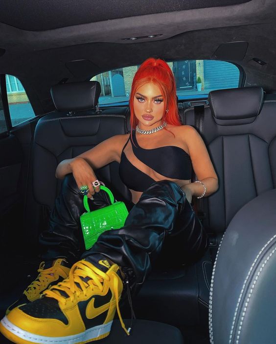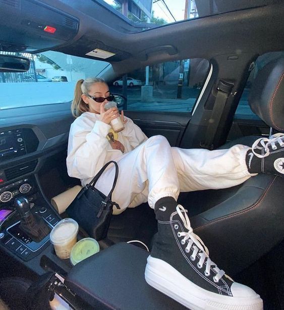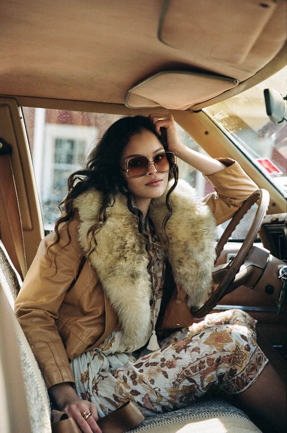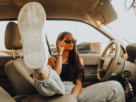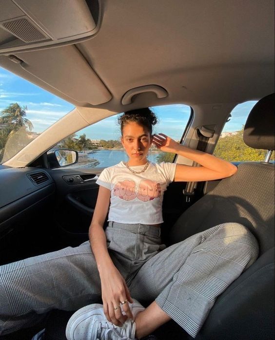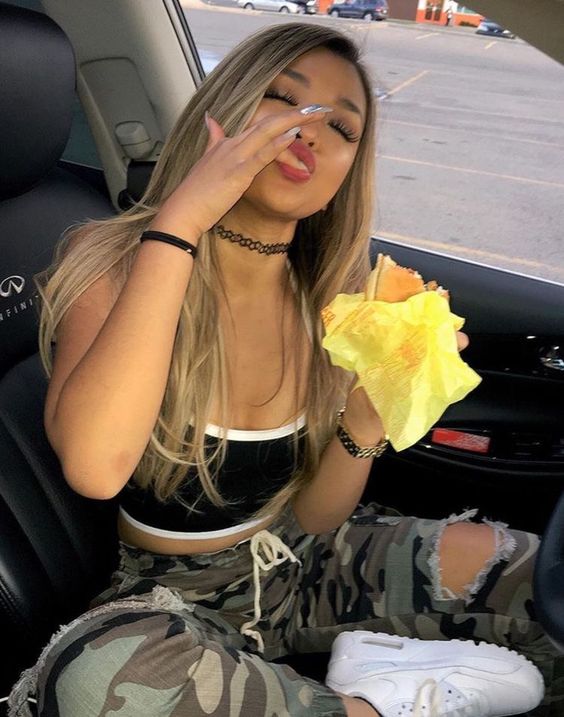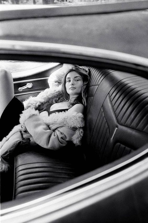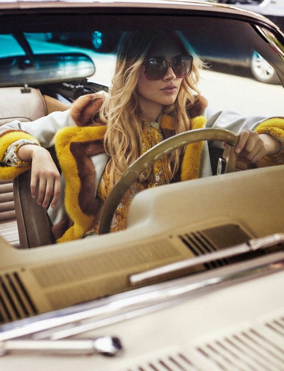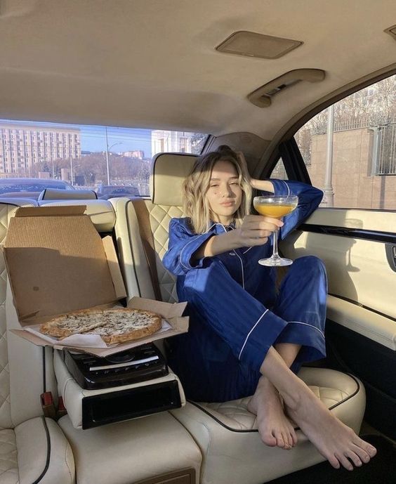 На фото наша героиня предстает в необычном образе - она не в гимнастическом купальнике, без пучка и грима. Мы видим ее совсем близко, так будто сидим рядом и можем хорошо рассмотреть. На ней трендовый фэшн образ с намеком на 70-ые, распущенные волосы и игривый макияж с нежно-розовыми губами. Она расслаблено сидит в своем авто и наслаждается пиццей. На ее профессию нам намекает лишь пара предметов из циркового реквизита, лежащие на полу и необычная поза, в которой наша героиня чувствует себя весьма комфортно из-за хорошей растяжки.